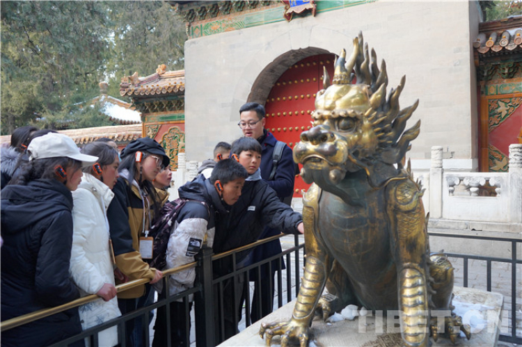 原來宮殿的排水系統(tǒng)既科學又美觀,原來屋脊神獸有避雷的作用,原來宮殿前的動物造型香爐是古代版“舞臺干冰制造器”……故宮的建造元素如此豐富,來自各個地區(qū)和民族。隨著講解員的介紹,同學們被古人的智慧深深折服,對這座皇家園林有了了解和自己的認識。站在宮殿的高處,學生們遙望到矗立的白塔,遙望到屋頂龍形裝飾的雨花閣,據(jù)說里面都是清朝皇帝收藏關(guān)于藏傳佛教的“寶物”,那里有關(guān)于西藏的歷史故事。