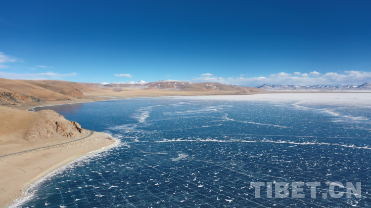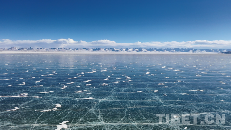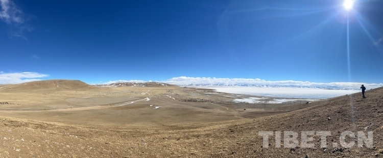 爬上一座山丘,視野陡然明亮開(kāi)闊起來(lái)。原本土黃色的藏北天然牧場(chǎng)高低起伏,黑牦牛零星地散落在山坡,登上高處后,天際圣境納木錯(cuò)便映入眼簾。初春時(shí)節(jié)的拉薩依然春寒料峭,納木錯(cuò)的落雪還未完全消融,站在高處俯視,這片安靜的大湖被陽(yáng)光反射得白茫茫一片。更幸運(yùn)的是碰到了晴好的天氣,白云與湖冰相襯,亦與遠(yuǎn)山相接,視線(xiàn)盡頭的念青唐古拉山脈直視無(wú)礙,畫(huà)面猶如“半池白云半池玉”般頗具美感。