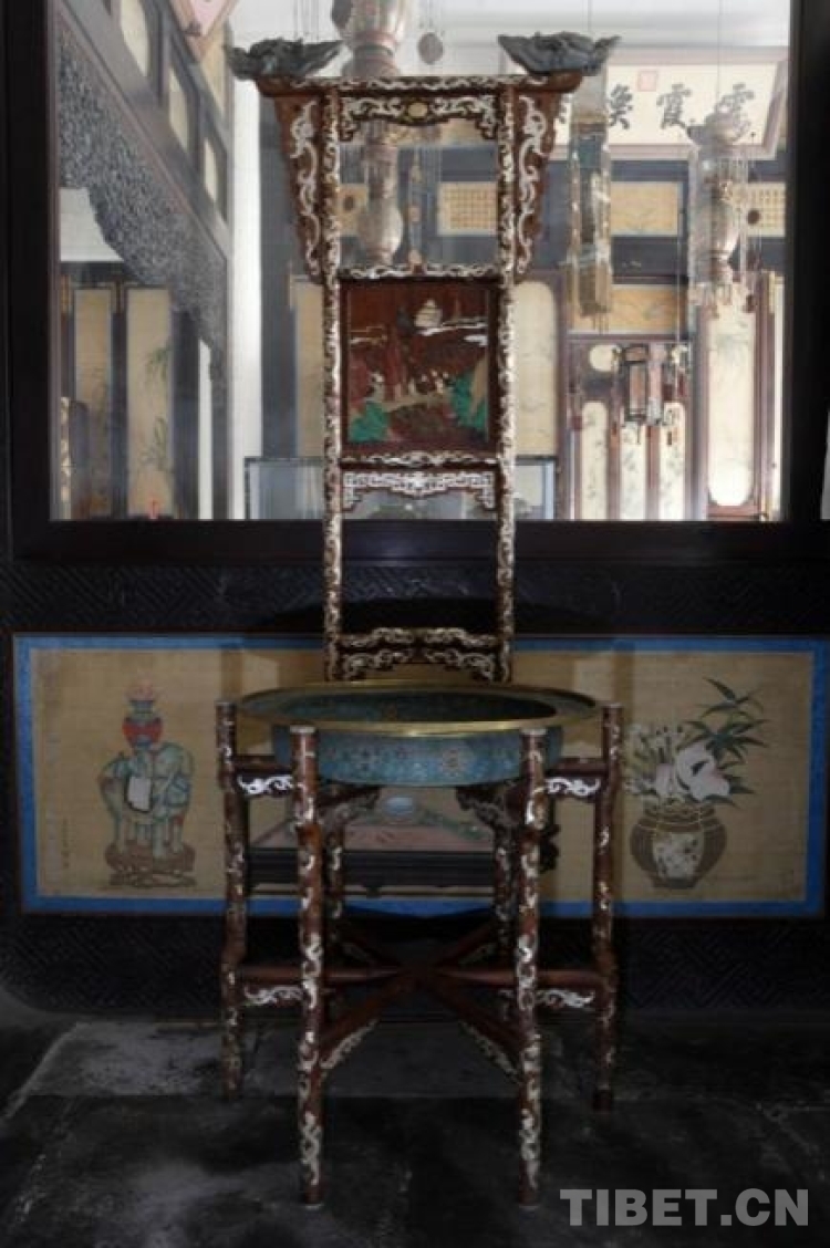 此款黃花梨木百寶嵌龍紋盆架,通體鑲嵌由螺鈿雕刻而成的草龍及拐子龍。前足高74.5厘米,通高201.5厘米,徑71厘米 。盆架六足,由兩層相交的棖子相連。選材優(yōu)良,質(zhì)堅且木色、紋理俱佳。中牌子鑲嵌更見華麗,由牙、角、綠松石、壽山石、瑪瑙、金、銀等組成職貢圖,其中有高山陡崖、蒼松流水及各色人物,遠處彩色祥云中呈現(xiàn)高大的殿堂,猶如人間仙境。(中國西藏網(wǎng) 綜合/周晶)