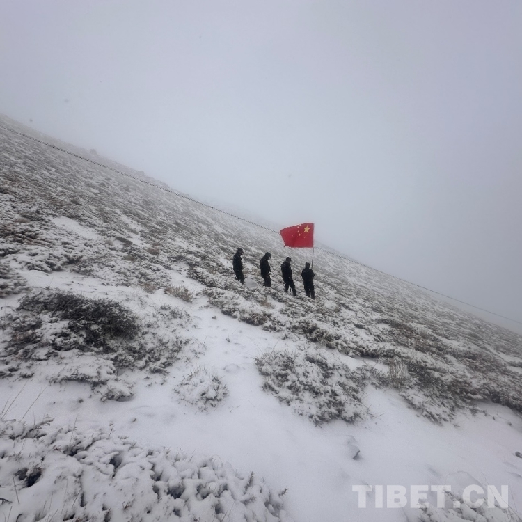 圖為斜爾瓦執(zhí)勤點(diǎn)民警冒著風(fēng)雪在中尼7號界樁旁巡邏踏查 攝影:格熱