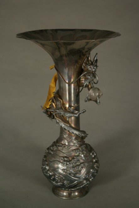 此款銀蟠龍紋花瓶,高39厘米,口徑22厘米,底徑9.5厘米。喇叭形口,長(zhǎng)頸,球形腹,底有圈足。瓶身腹部捶鏨裝飾,翻騰的海水中浪花飛濺,一長(zhǎng)龍從瓶頸基部躍出波濤,以圓雕形式大海盤(pán)旋而上,龍身纏繞瓶頸,龍首貼近喇叭形瓶口下,頭高昂,短粗的龍角豎立,伸出一龍爪擎一晶瑩剔透水晶球一枚。寓“龍戲珠”之意。銀瓶為一對(duì),是宮中的貢品,寓意“雙龍戲珠”。每只花瓶皆附有黃條,其上墨書(shū):“小村壽太郎進(jìn)”字樣。