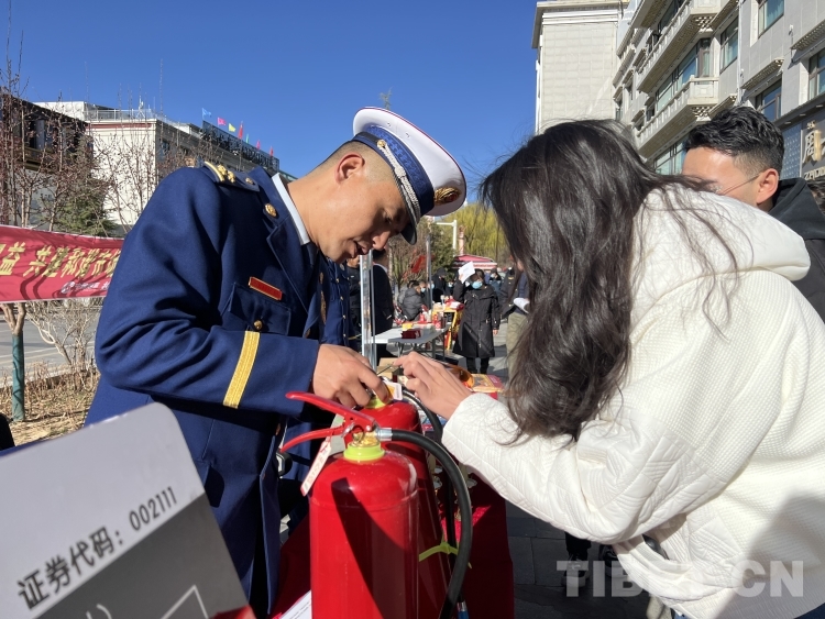 圖為活動現場拉薩市消防支隊工作人員向來往市民講解如何使用滅火器 攝影:德吉卓瑪
