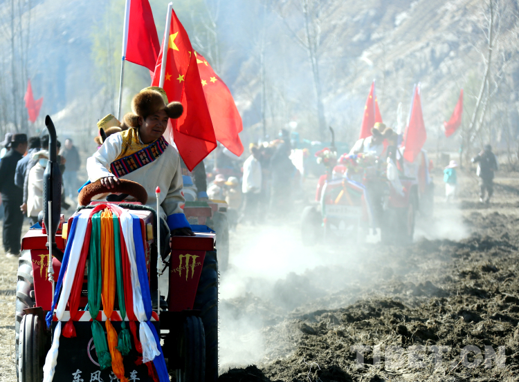 整個(gè)活動(dòng)充滿儀式感。村民們先是來(lái)到田地中央燃桑香、獻(xiàn)貢品,祈求風(fēng)調(diào)雨順、無(wú)災(zāi)無(wú)害、莊稼豐收。開耕第一犁在吉祥喜慶的藏戲《扎西雪巴》表演中拉開了序幕,一輛輛插著五星紅旗,用五彩哈達(dá)、花朵、吉祥圖案裝扮一新的拖拉機(jī)一字排開,涌向待墾的農(nóng)田進(jìn)行翻耕,播撒第一粒種子。