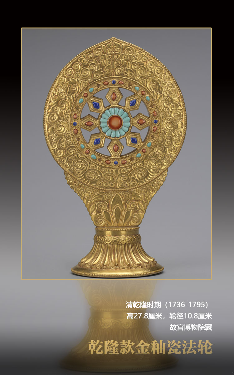 此件法輪,瓷質(zhì),通體飾金釉,仿金質(zhì)法輪。輪兩面紋飾相同,輪面呈扁平圓桃形,刻云紋、卷草紋、連珠紋,正中心飾以由淺藍色花瓣和橙紅色花蕊組成的菊花,花周圍由八塊菱形輪輻連接輪壁,輪輻間呈鏤空狀,以此代表佛陀之八正道。輪輻及外周一圈飾以橙、藍、淺藍相間的寶石釉色,仿金法輪鑲嵌珊瑚、青金石、綠松石,色彩鮮亮,寶石質(zhì)感逼真。底座上下邊緣環(huán)飾卷云紋、連珠紋,之間雕凸起的長蓮瓣,蓮瓣尖微卷,底部有篆書體“大清乾隆年制”三行款識。此法輪工藝精湛,系乾隆時期仿嵌寶石金器的杰作。
