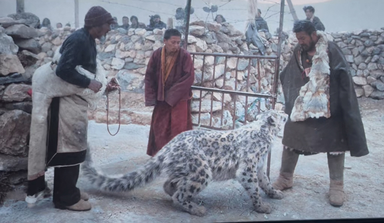 影片的結(jié)尾似乎很突然,雪豹終究沒有死在受損牧人暴怒的情緒和揮舞的錘子下,在人類文明的關(guān)照下,被主動(dòng)解圍,回歸雪山,與小雪豹相會(huì)相伴。只有萬導(dǎo)這種深邃包容、沉著冷靜又充滿睿智的作家、藝術(shù)家才能挖掘和表現(xiàn),這里蘊(yùn)含著生命的慈悲和世人的智慧。對此,我們還有哪些拷問呢?