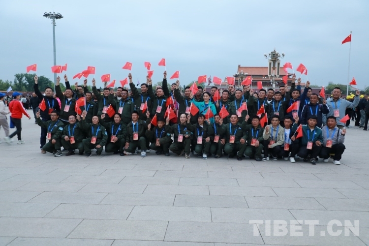 圖為“西藏自治區(qū)野生動(dòng)物保護(hù)員進(jìn)京考察學(xué)習(xí)團(tuán)”成員觀看升旗儀式的集體留念 攝影:莫干措