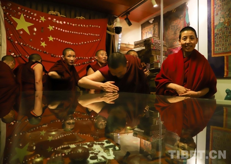 圖為尼眾在尼池拉康民族團(tuán)結(jié)系列館參學(xué)