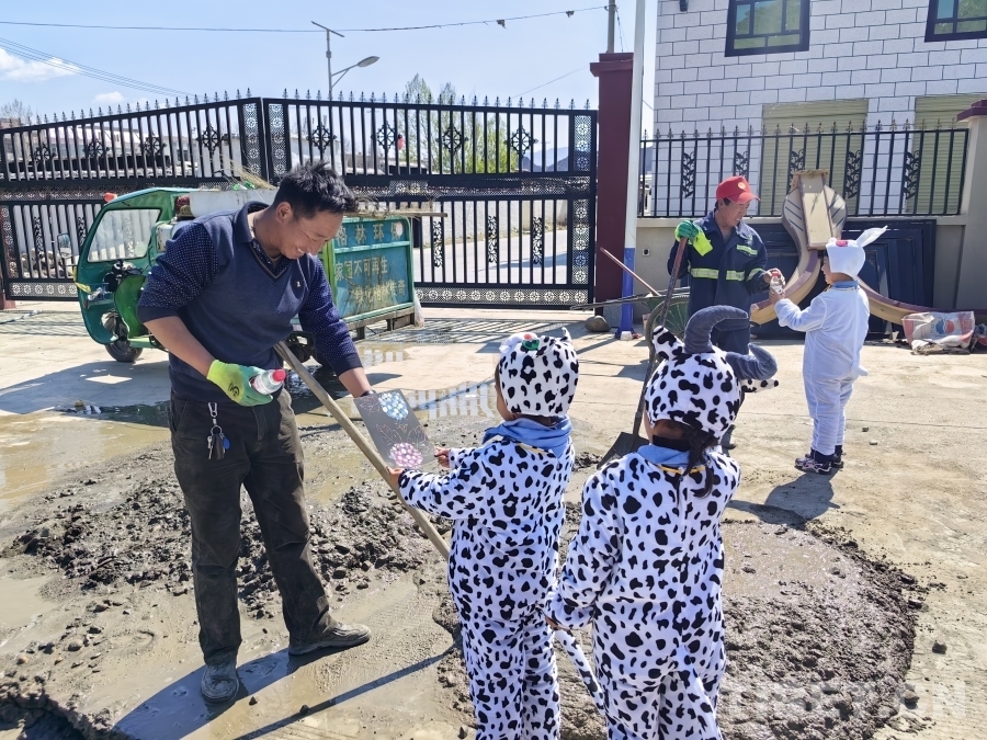 圖為拉孜縣幼兒園孩子們“變身”可愛的小動(dòng)物給身邊的勞動(dòng)者送水、送畫、送溫暖