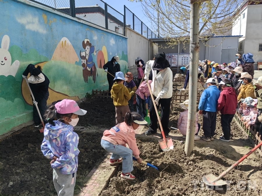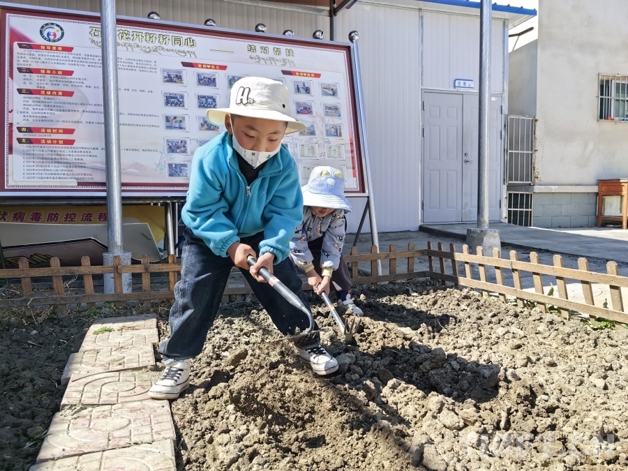 圖為拉孜縣幼兒園的孩子們?cè)谛@刨土種花