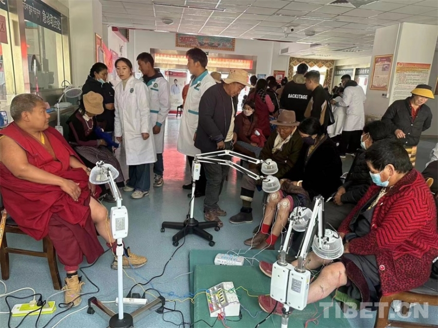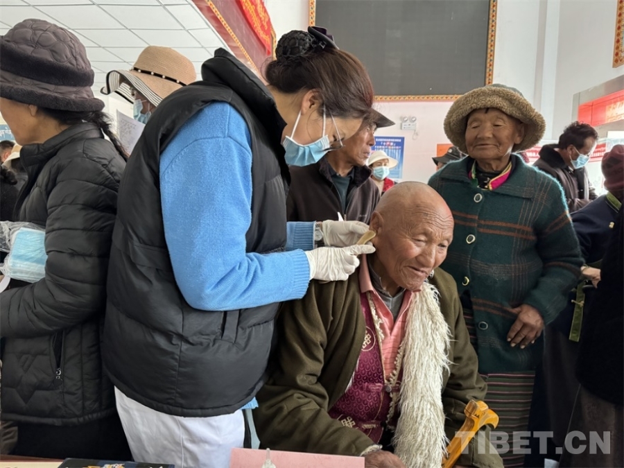 圖為洛隆縣藏醫(yī)院及人民醫(yī)院的醫(yī)療團(tuán)隊在現(xiàn)場開展平衡火罐、艾灸等中醫(yī)診療服務(wù) 供圖:洛隆縣藏醫(yī)院
