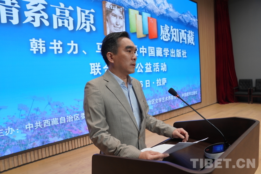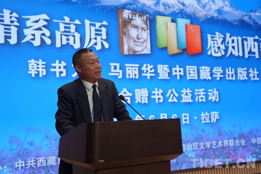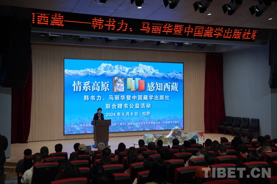 中國(guó)西藏網(wǎng)訊 6月6日上午,由西藏自治區(qū)黨委宣傳部主辦,自治區(qū)文聯(lián)、中國(guó)藏學(xué)出版社承辦的“情系高原 感知西藏——韓書(shū)力、馬麗華暨中國(guó)藏學(xué)出版社聯(lián)合贈(zèng)書(shū)公益活動(dòng)”在西藏美術(shù)館學(xué)術(shù)報(bào)告廳舉辦。自治區(qū)黨委宣傳部副部長(zhǎng)何瑞,中國(guó)藏學(xué)出版社社長(zhǎng)洪濤,自治區(qū)文聯(lián)黨組成員、副主席陳人杰,自治區(qū)黨委原常委、自治區(qū)政協(xié)原副主席德吉措姆,自治區(qū)文聯(lián)原主席、西藏美術(shù)家協(xié)會(huì)原主席韓書(shū)力,中國(guó)藏學(xué)出版社原總編輯、自治區(qū)文聯(lián)原副主席、西藏作家協(xié)會(huì)原副主席馬麗華等參加活動(dòng)。