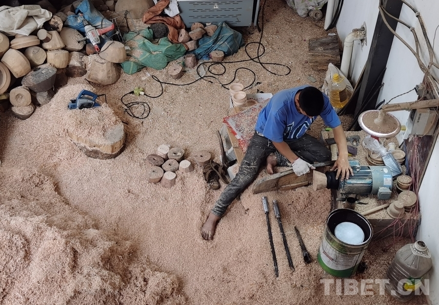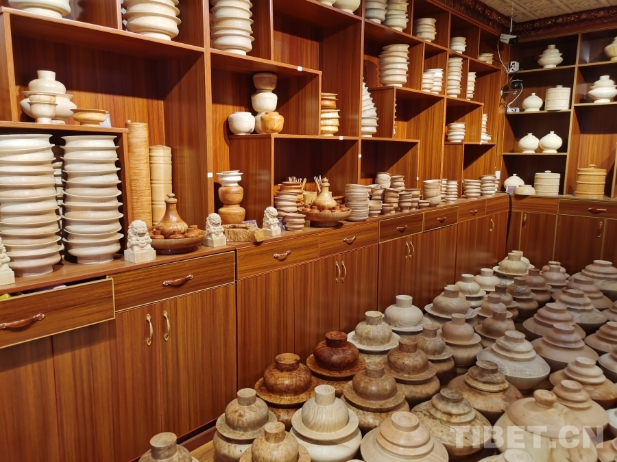 我們首先來(lái)到的是四川省非物質(zhì)文化遺產(chǎn)項(xiàng)目——藏族民間車模技藝體驗(yàn)基地。基地一層是工作區(qū),一位師傅正在全身心制作木質(zhì)生活用具,絲毫沒有察覺我們的到來(lái)。于是沒有過(guò)多打擾,我們徑直來(lái)到二樓展品陳列區(qū)。藏族民間車模技藝傳承人格絨次仁的兒子洛絨次仁拿起一個(gè)木碗,臉上露出樸實(shí)而靦腆的微笑介紹道,“這些都是選用樹瘤制作而成,一般選用鵝掌木、杜鵑等15類樹木,因?yàn)橹蹦救菀琢验_。為了用具不裂開,處理后的樹瘤煮水后需晾干五至六個(gè)月,一個(gè)木碗制作工序可能要長(zhǎng)達(dá)半年才能完成。此項(xiàng)技藝在家族傳承至今已有四代,我們要做就做好一點(diǎn)?!甭褰q次仁大哥希望更多人能了解這項(xiàng)非物質(zhì)文化遺產(chǎn),有更多人愿意來(lái)傳承學(xué)習(xí)這份技藝,有更多人喜歡他們制作的這些木質(zhì)生活用具。