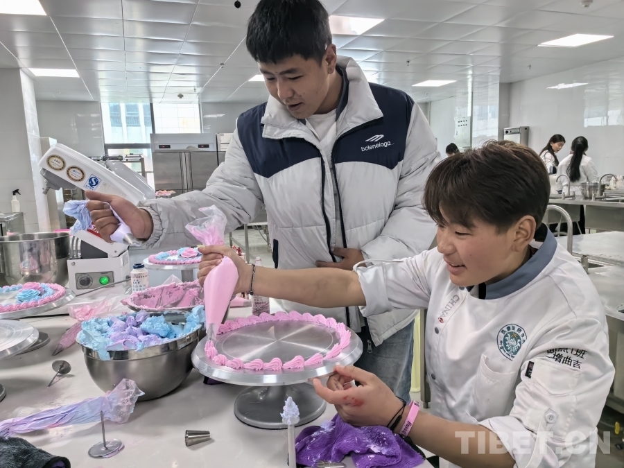 圖為西藏技師學(xué)院的學(xué)生正在面點(diǎn)課上練習(xí)裱花 攝影:王淑