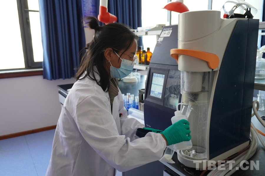 圖為畢業(yè)生尼瑪瓊決正在實(shí)驗(yàn)室檢測(cè)樣品肉的新鮮度 攝影:張曉琪