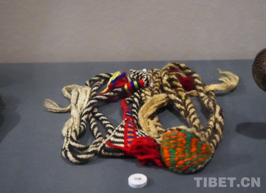 圖為“宗山號(hào)角——紀(jì)念西藏江孜抗英保衛(wèi)戰(zhàn)120周年主題展”展品——烏爾朵,一種牧民放牧牛羊用的皮制工具,可以把拳頭大小的石頭裹起來(lái)甩出去,用以驅(qū)趕或圍攏牲畜。攝影:王茜