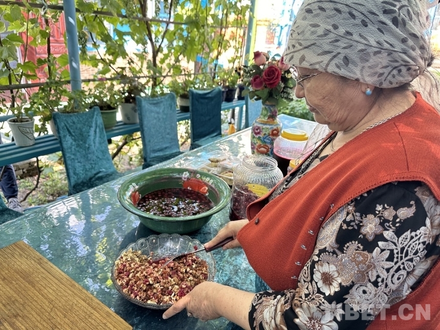 圖為63歲的哈妮克孜正在制作樹(shù)莓核桃的包子餡兒 攝影:楊眉笑