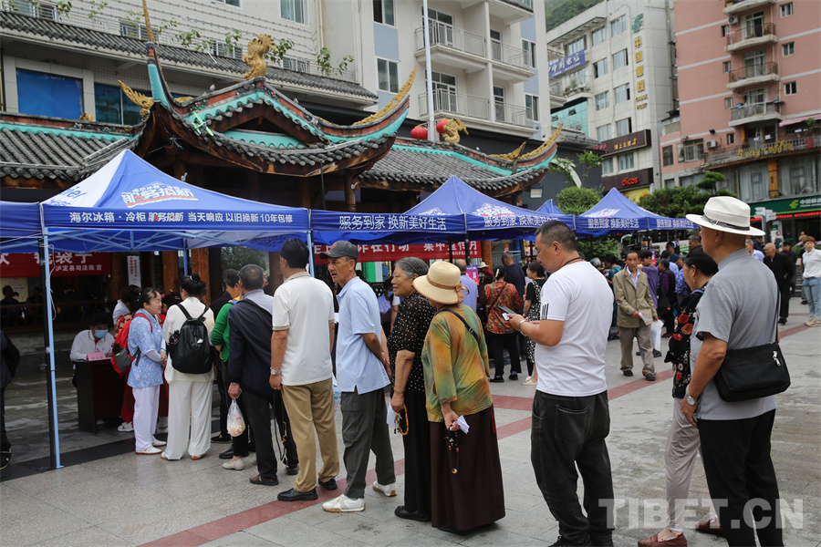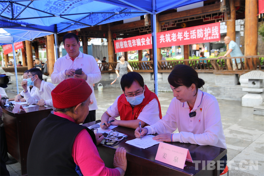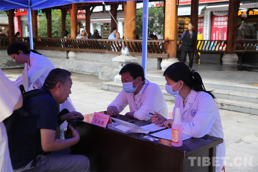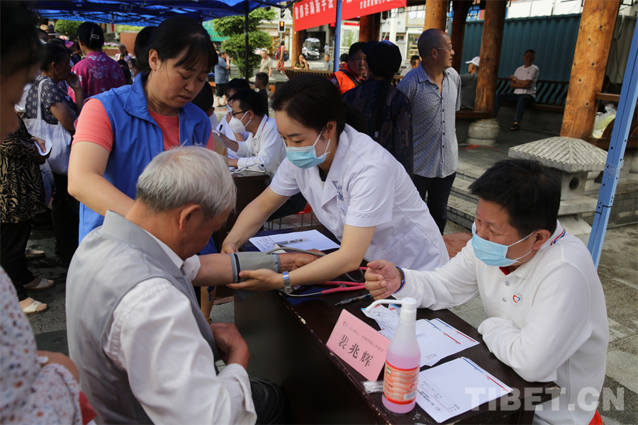 圖為瀘定橋廣場義診點(diǎn),專家正在為患者量血壓 攝影:登真巴珍