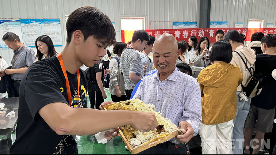 7月11日,140余名香港青少年帶著對(duì)知識(shí)的渴望來(lái)到海南州貴德縣,踏上了生態(tài)研學(xué)之旅。在青藏華峰中蜂蜂業(yè)有限公司保種場(chǎng)(以下簡(jiǎn)稱保種場(chǎng)),群山環(huán)抱,樹木蔥蘢的山坡里分布著許多蜂箱,同學(xué)們?cè)邳S河岸邊與中華蜜蜂來(lái)了場(chǎng)親密邂逅。