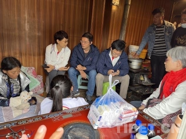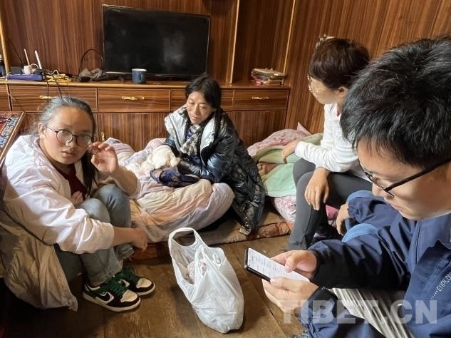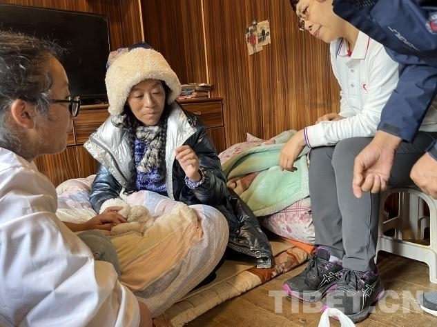 在義診活動(dòng)進(jìn)行的同時(shí),幾位專家還分撥前往貧困家庭慰問。其中,北京地壇醫(yī)院的中醫(yī)科副主任楊玉英,北京地壇醫(yī)院婦科副主任劉軍,北京老年醫(yī)院呼吸科副主任劉前桂,北京大學(xué)第一醫(yī)院骨科副主任徐貝宇一行來到了離措拉鎮(zhèn)不遠(yuǎn)的德西村山坡上,去阿珍家慰問看診。據(jù)了解,阿珍的母親沖曲措于 2019 年進(jìn)行了胃癌手術(shù),術(shù)后做了五次化療,于 2020 年末完成化療。然而,2024 年 6 月份,沖曲措又被查出患有肺炎。由于吃不下飯,沖曲措體重嚴(yán)重下降,營(yíng)養(yǎng)嚴(yán)重不良。。
