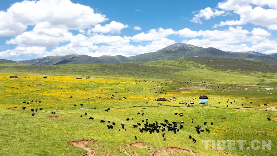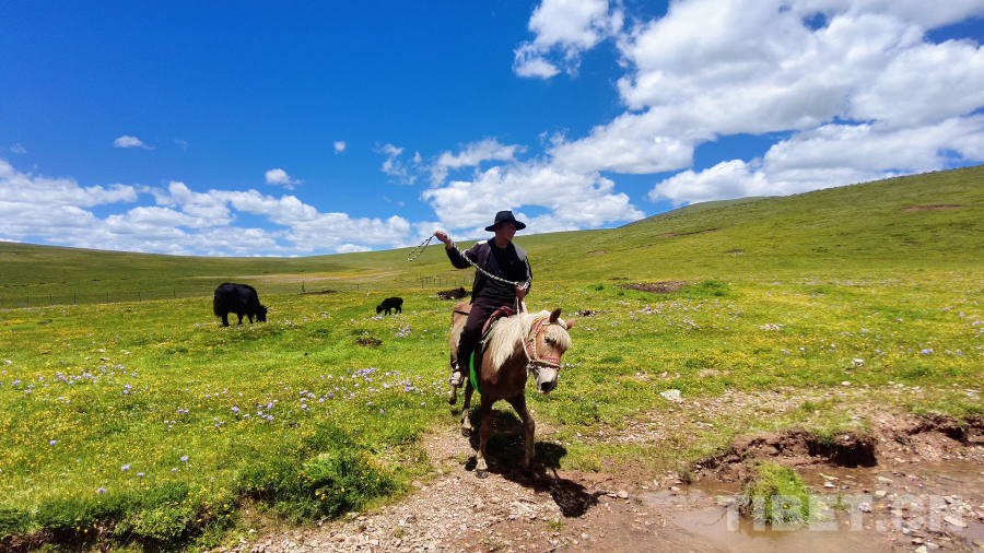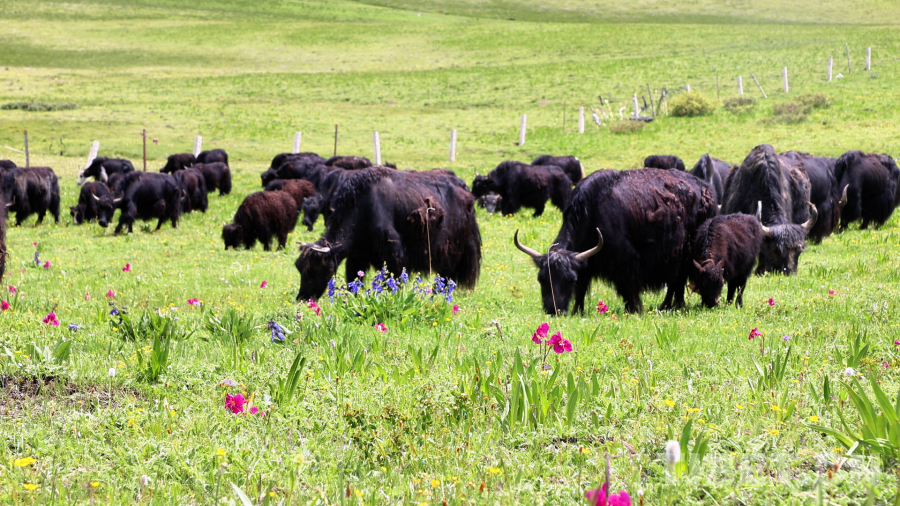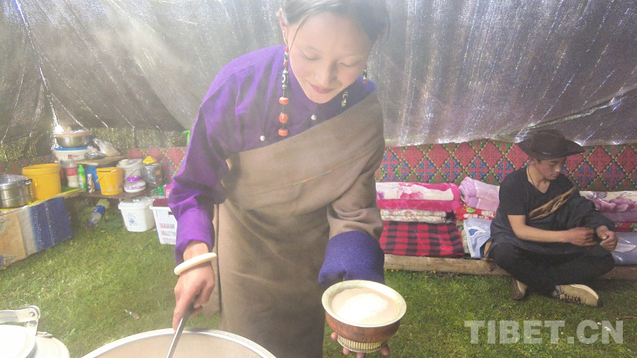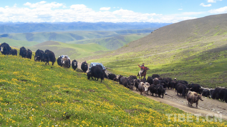 早晨天剛蒙蒙亮,他們就準(zhǔn)備出發(fā)了,一家人把生活必需品黑帳篷,火爐,鍋碗瓢盆,被褥及酥油糌粑等物資打包裝車,由家人先駕駛拖拉機(jī)把所有物資運(yùn)送到夏季遠(yuǎn)牧點(diǎn),四郎彭措則和他的侄兒騎馬趕牛出發(fā)。冬季牧場到夏季牧場距離60公里,他們經(jīng)過9個小時的遷徙,終于在下午3點(diǎn)到達(dá)夏季牧場。此時他的家人也在鄰居的幫助下搭好了帳篷,煮好了酥油茶等待著他們。到了夏季牧場,牦牛們也迫不及待奔向了肥美的水草,四郎彭措和他的侄兒也終于可以卸下滿身的疲憊,品嘗家人們準(zhǔn)備好的美食。夏季牧場正是一年當(dāng)中最美的季節(jié),草原上開滿了五顏六色的花朵,多日不見的好友也帶著自己的家人早一步駐扎在此地,四郎彭措說道:“夏季放牧,轉(zhuǎn)場雖然辛苦,但也是一年中難得的閑暇時光。夏季水草肥美,牦牛們有充足的食物,來到夏季牧場放牧的牧民也有更多的活動時間,賽馬、唱歌、跳鍋莊舞是我最喜歡的活動?!?/p>