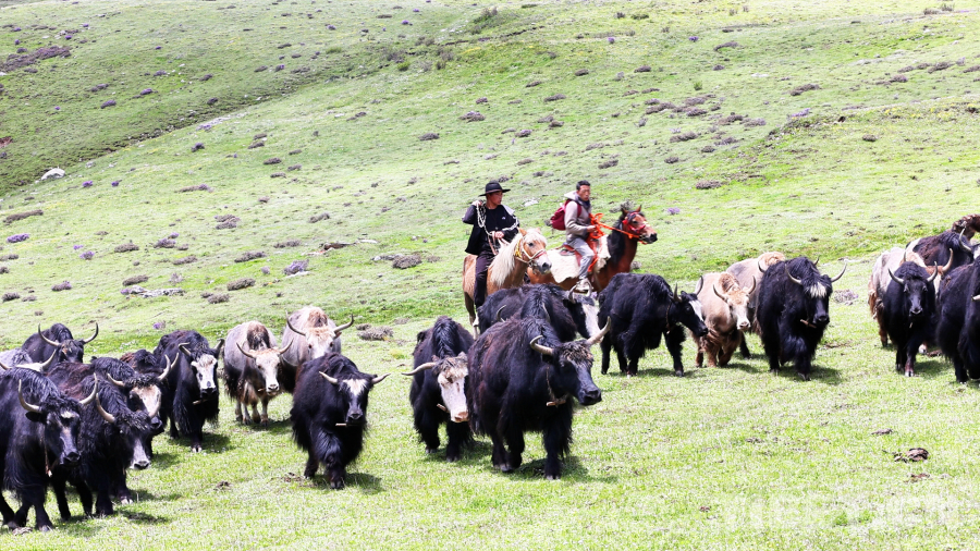 昌臺草原的7月,進(jìn)入夏季,白玉縣阿察鎮(zhèn)阿察村的牧民們便開始轉(zhuǎn)移牧場,從冬季牧場日通草原轉(zhuǎn)移到夏季牧場石門科草原,每一次轉(zhuǎn)場都是一次大遷徙,氣勢磅礴壯觀。四郎彭措一家也開始了今年的轉(zhuǎn)場工作,沿著冬季牧場到夏季牧場的牧道,四郎彭措和表弟仁真巴登兩位牧人騎著兩匹駿馬,趕著一群牦牛有序地進(jìn)行著轉(zhuǎn)場。