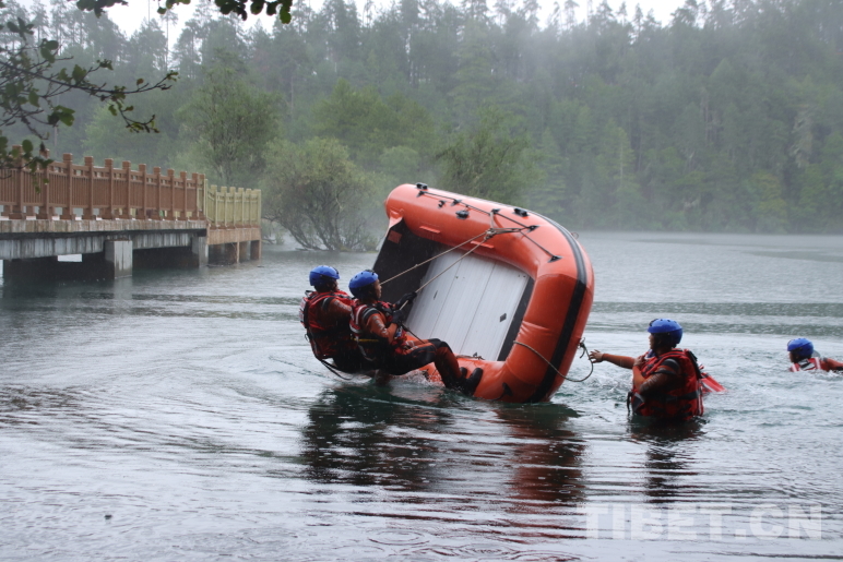 圖為波密縣森林消防中隊指戰(zhàn)員進行翻船自救訓(xùn)練