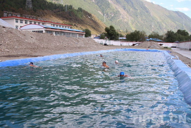 圖為波密縣森林消防中隊指戰(zhàn)員利用自建簡易泳池開展游泳訓(xùn)練