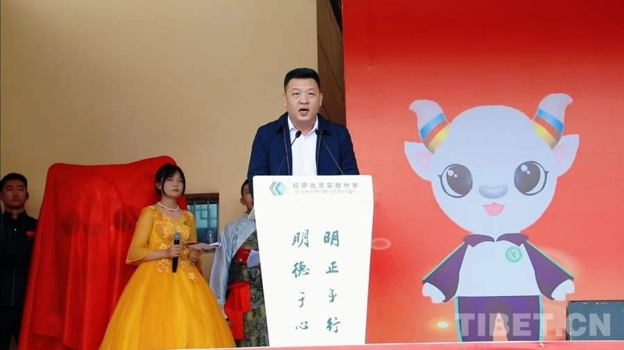 圖為梁新在拉薩北京實(shí)驗(yàn)中學(xué)十周年校慶上講話(huà) 圖片由校方提供