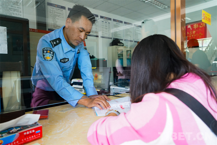 圖為移民管理警察丹增永鋒正在辦理窗口業(yè)務(wù) 攝影:趙振宇