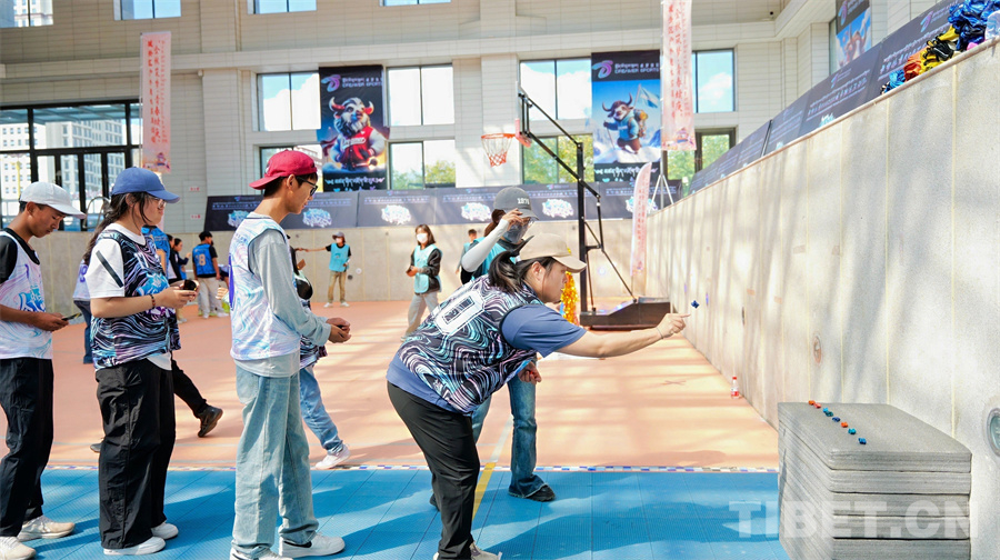上午十點,所有人員集中在卓夢南環(huán)體育公園,在總教練晉美次旦的講解和帶領(lǐng)下,開始熱身、熟悉游戲規(guī)則和獎勵辦法、進(jìn)行分組等,一切準(zhǔn)備就緒后,趣味活動正式開始。上午的活動開設(shè)了中國古代投擲游戲趣味投壺、西藏傳統(tǒng)民間體育游戲趣味打牛角和阿久、趣味飛盤、趣味旱地冰壺等多種傳統(tǒng)和流行的運(yùn)動項目。