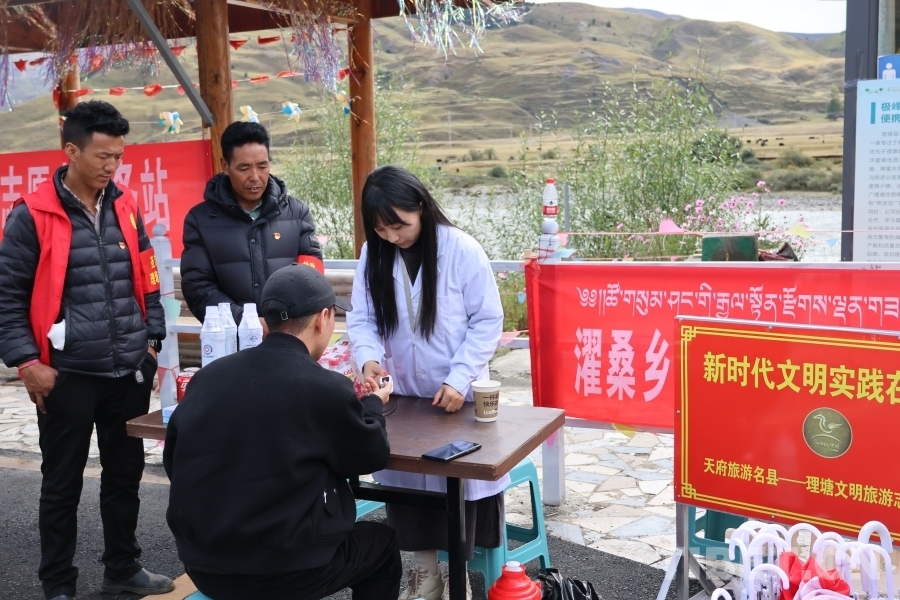 從海拔4700多米的卡子拉山,到一派田園風光的濯桑片區(qū);從傳統(tǒng)文化氣息濃厚的勒通古鎮(zhèn),到一望無際的毛埡大草原,理塘縣共設(shè)立了19處新時代文明實踐旅游服務(wù)站,每處站點都配備了至少5名志愿者,從9點到18點,全天提供指路問詢、文明旅游宣傳、血氧飽和度測量以及免費開水、免費雨傘、應(yīng)急充電等志愿服務(wù),并協(xié)助交警開展交通安全宣傳、文明行車引導等工作。