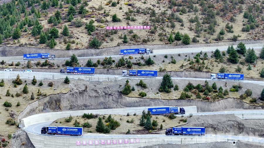 圖為中遠海運集團2024年援建的西藏自治區(qū)昌都市洛隆縣臘久鄉(xiāng)第一小學集裝箱食堂正運輸行駛在國道G349等道路上