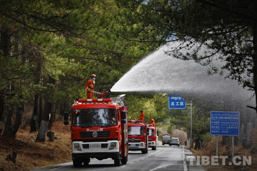 圖為消防員沿重點林區(qū)道路開展灑水增濕作業(yè)