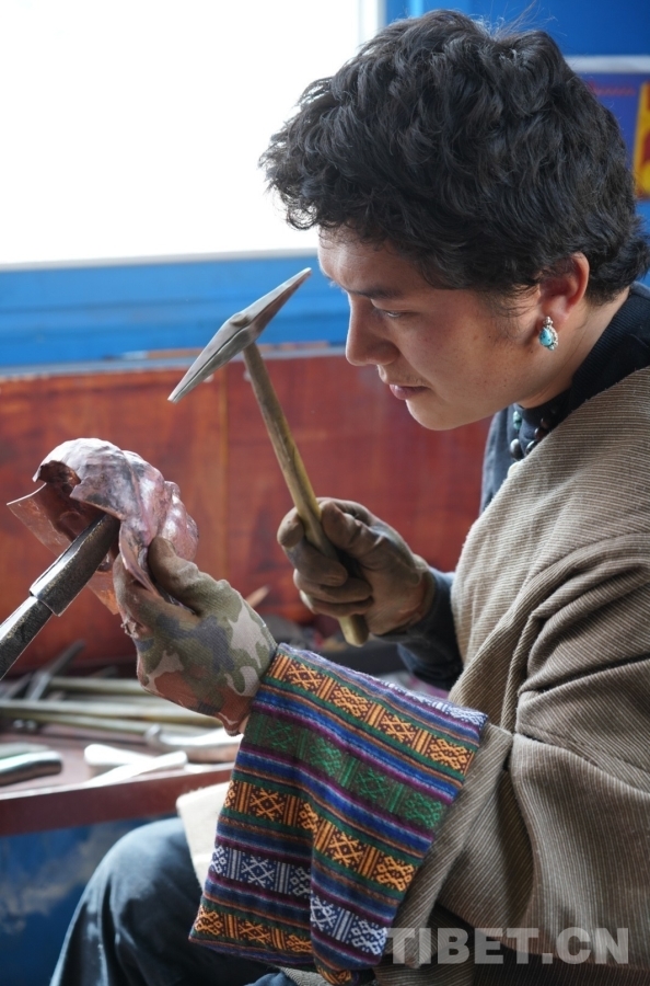 再次見到朗加時,他緩步向我走來,臉上掛著陽光般溫暖的笑容,眼神澄澈而深邃。他身著極具藏族特色的紅色繡花馬甲,這件馬甲是朗加讀小學(xué)時,母親得知朗加要在學(xué)校表演鍋莊舞,特地親手為他制作的,當時母親特意做大了些,誰也未曾想到竟一直穿到今天。十幾年過去了,繡花馬甲依舊完好如初。這也不再只是一件馬甲,更是母親的愛和溫暖,一直伴隨著朗加無數(shù)個日夜,陪伴他奔赴遠方,在傳承巴爾瑪錘揲法造像技藝的道路上走得越來越遠。(中國西藏網(wǎng) 文/鄒慧)