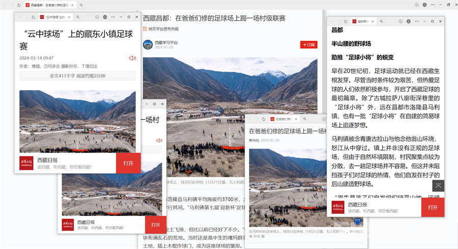 今年一月,延續(xù)七屆的馬利鎮(zhèn)足球“迎新杯”在“爸爸們修建的足球場”開賽的消息備受關注。一時間《在爸爸們修建的足球場上踢一場村級聯(lián)賽》《“云中球場”上的藏東小鎮(zhèn)足球賽》《半山腰上的野球場 助推“足球小將”的蛻變》多篇稿件在China Daily、新華社、西藏日報、學習強國、昌都發(fā)布等平臺紛紛亮相,引起不少關注。