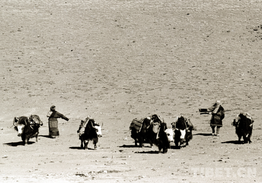 圖為逐水草而居,趕著馱物牦牛正在轉(zhuǎn)移草場(chǎng)的藏北雙湖辦事處(現(xiàn)雙湖縣)的牧民人家(唐召明1987年攝)