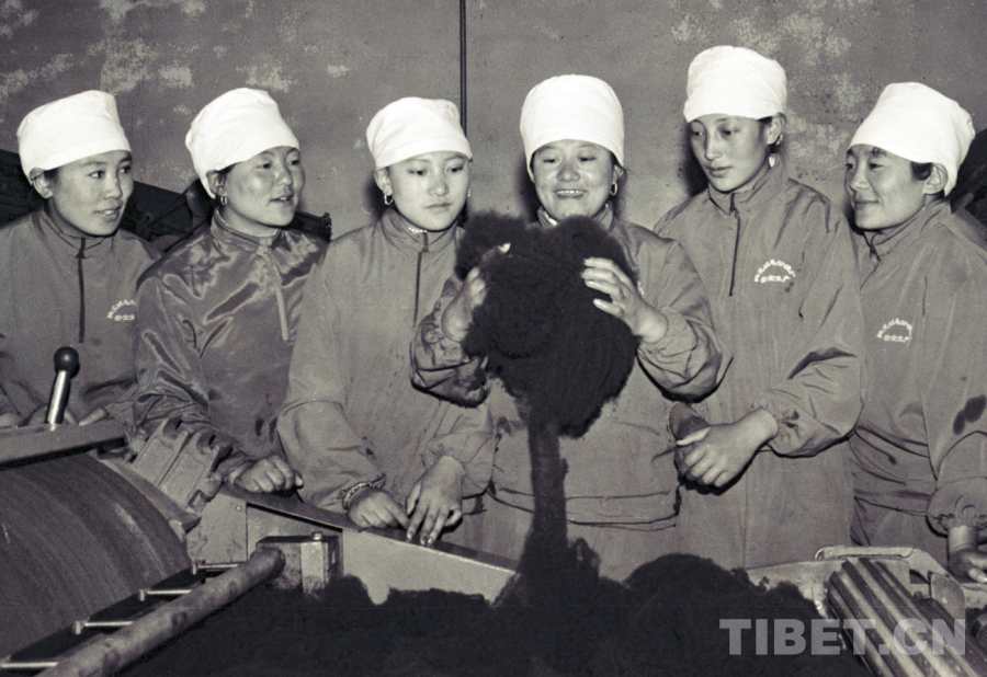 圖為過(guò)去手拿牧鞭的牧女格桑措姆(左四)和同伴們?cè)谝黄鸱窒韯趧?dòng)成果——優(yōu)質(zhì)牦牛絨。她們都是藏北班戈縣絨毛分梳廠的生產(chǎn)能手(唐召明1994年5月2日攝)