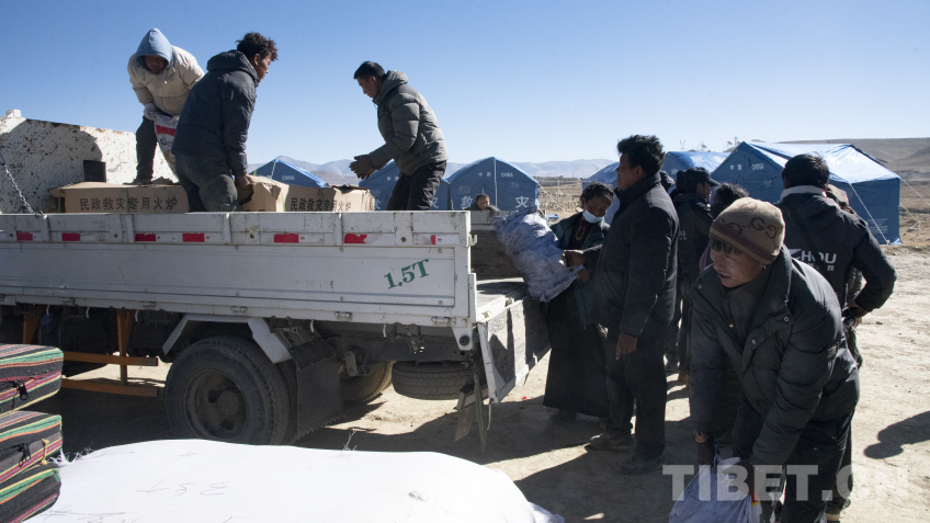 圖為定日縣曲洛鄉(xiāng)左措村安置點(diǎn)受災(zāi)群眾正在有序搬運(yùn)物資 攝影:趙振宇