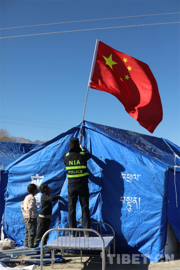 圖為西藏移民管理警察在定日縣長所鄉(xiāng)雜村受災(zāi)安置點懸掛五星紅旗 攝影:郭遠(yuǎn)敬