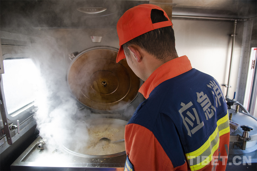 圖為山南市消防救援支隊消防員正在為受災群眾準備熱餐 攝影:趙振宇
