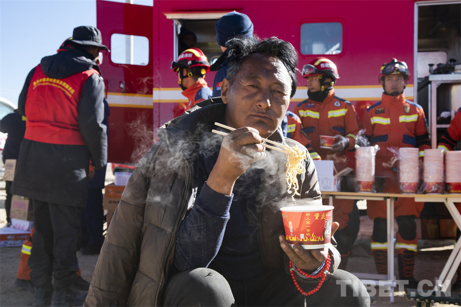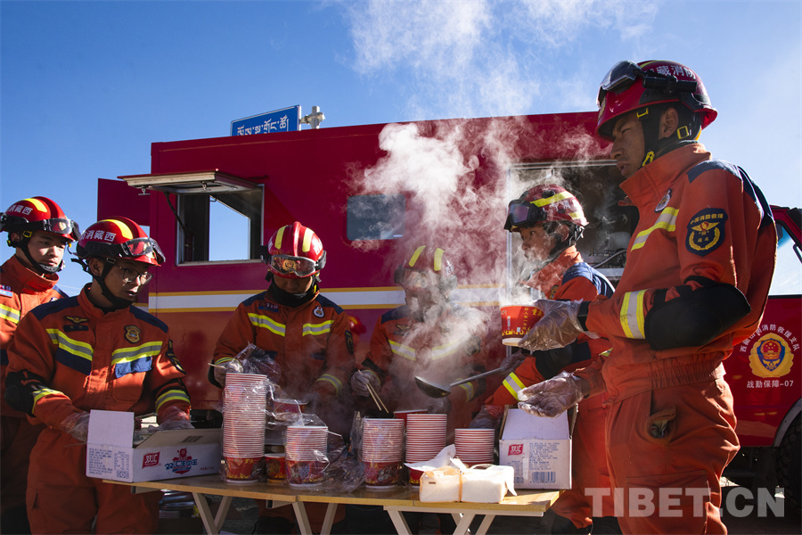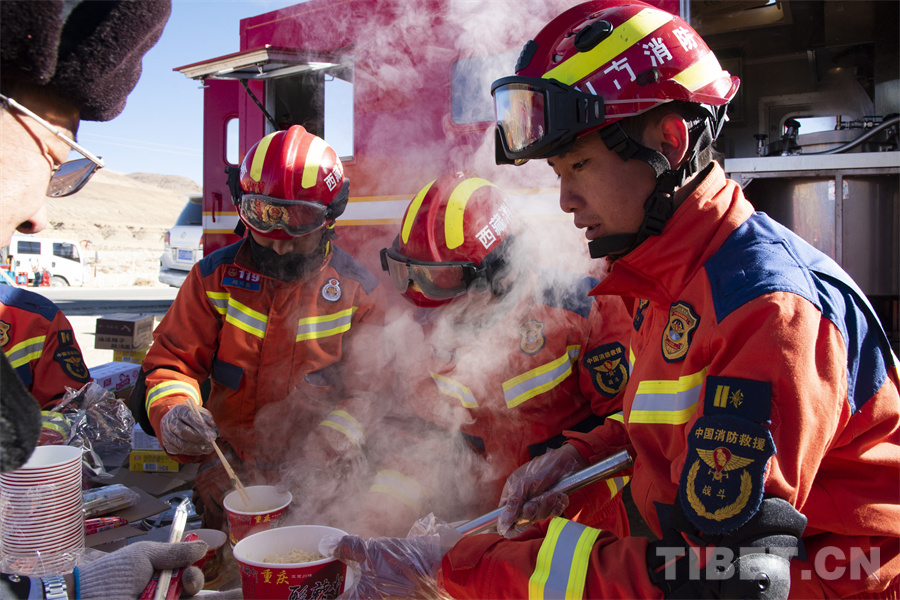 圖為山南市消防救援支隊消防員在受災安置點前發(fā)放熱餐 攝影:趙振宇