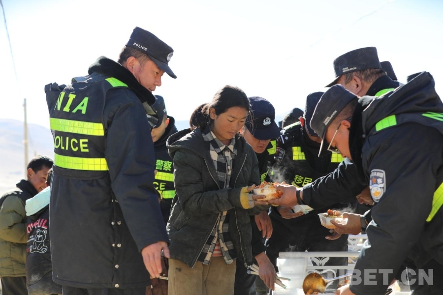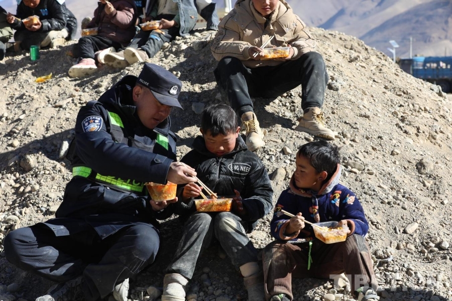 圖為在日喀則市定日縣長所鄉(xiāng)雜村安置點,移民管理警察為小朋友和群眾提供午餐 攝影:郭遠(yuǎn)敬