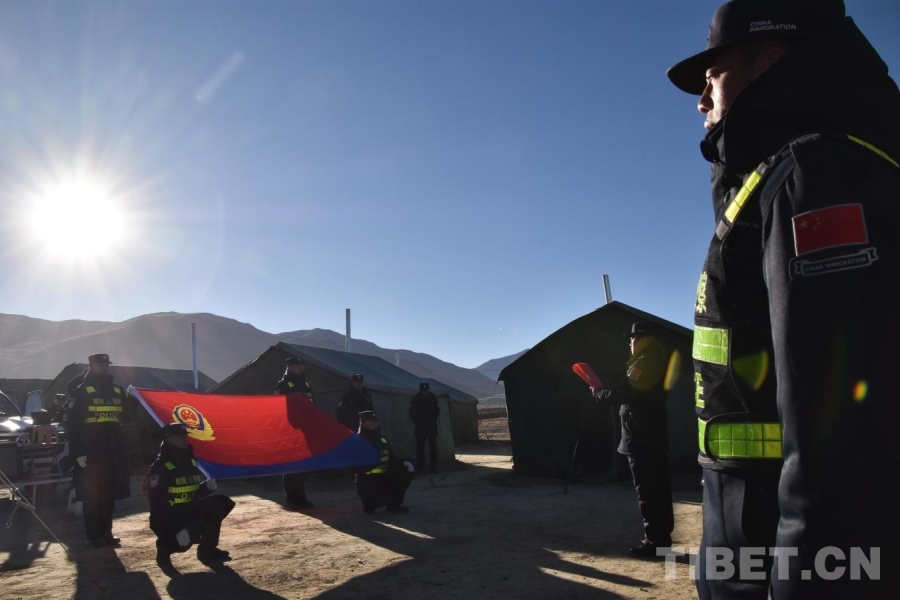 圖為中國人民警察節(jié)當(dāng)天,在日喀則市定日縣長所鄉(xiāng)雜村安置點,日喀則邊境管理支隊支隊長馬自防帶領(lǐng)安置點參與抗震救災(zāi)民警向警旗宣誓 攝影:崔娜