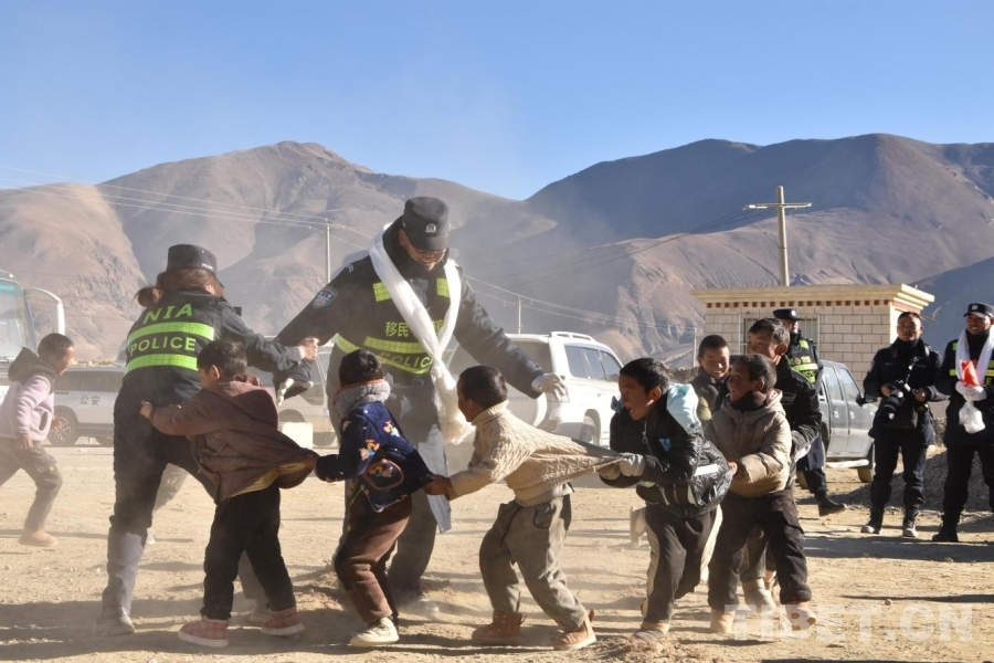 圖為在日喀則市定日縣長所鄉(xiāng)雜村安置點,移民管理警察和小朋友玩老鷹捉小雞游戲 攝影:卿光強(qiáng)