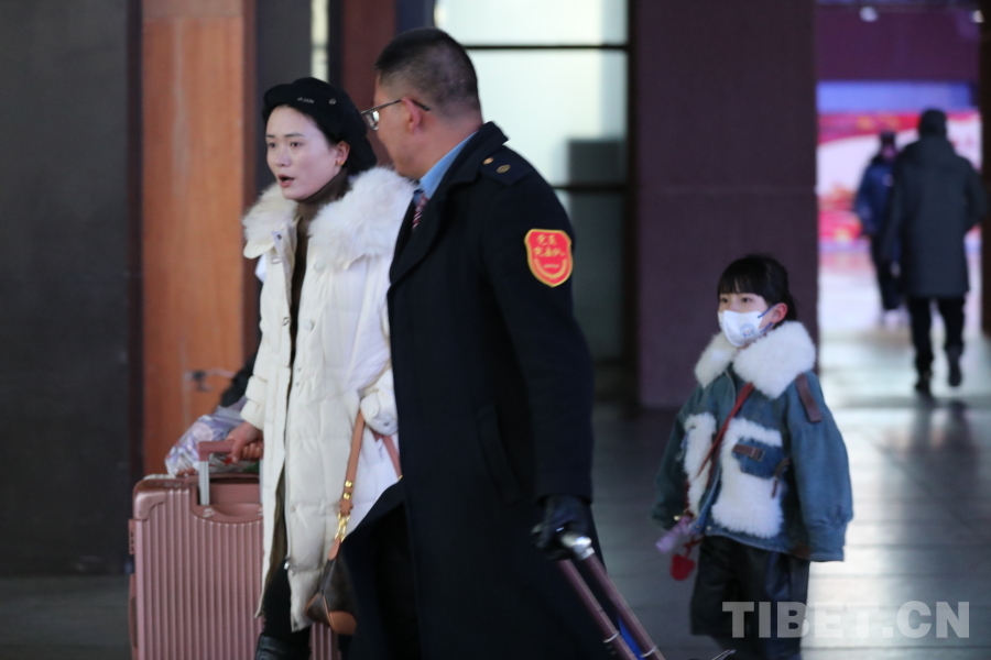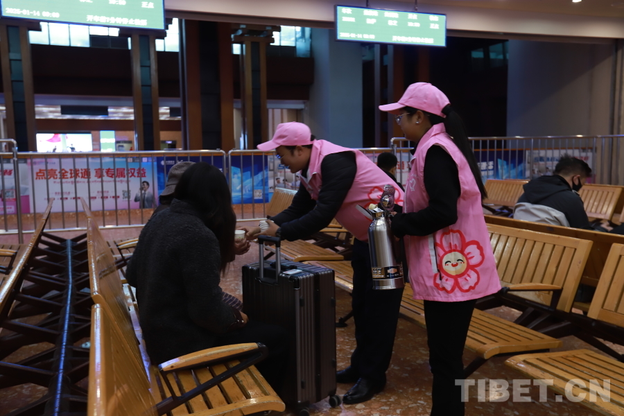 圖為拉薩車站春運首日志愿者為候車旅客服務(wù)