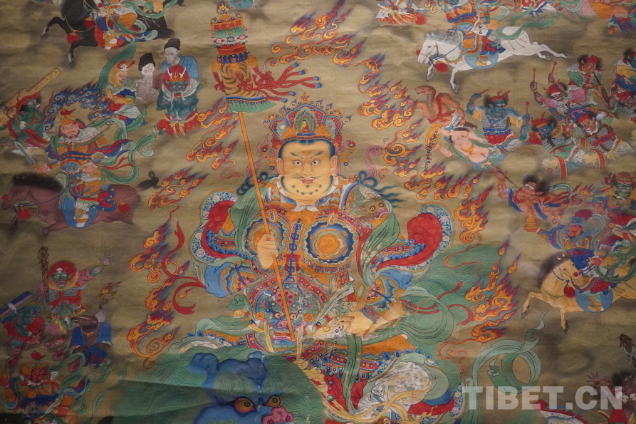 圖為清財(cái)神像唐卡局部。這幅主尊黃財(cái)神及八大馬王唐卡,主尊周圍生動(dòng)地繪滿了傳統(tǒng)道教水陸畫中常見的人物形象,反映了古代青藏高原與河西走廊地區(qū)的文化交流,體現(xiàn)出我國(guó)多民族文化在邊疆地區(qū)的廣泛互動(dòng) 攝影:張宇