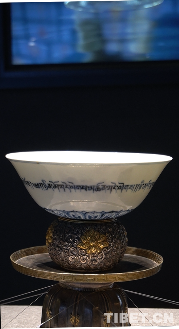 圖為“宣德年制”款青花藏文紋高足碗及銀鏨花紋碗座。高足碗是元代以來的重要瓷器樣式,這套高足碗外壁一圈書藏文吉語,大意為:日平安,夜平安,三寶永遠(yuǎn)賜平安。碗下側(cè)高足外圈飾蓮花紋,碗底書有“宣德年制”款,并配有一套錯(cuò)金銀簪花的碗托。風(fēng)格的融合不僅讓這套高足碗擁有跨越地域的文化韻味,更引領(lǐng)著參觀游客探索與欣賞民族交往交流交融帶來的無限可能 攝影:張宇