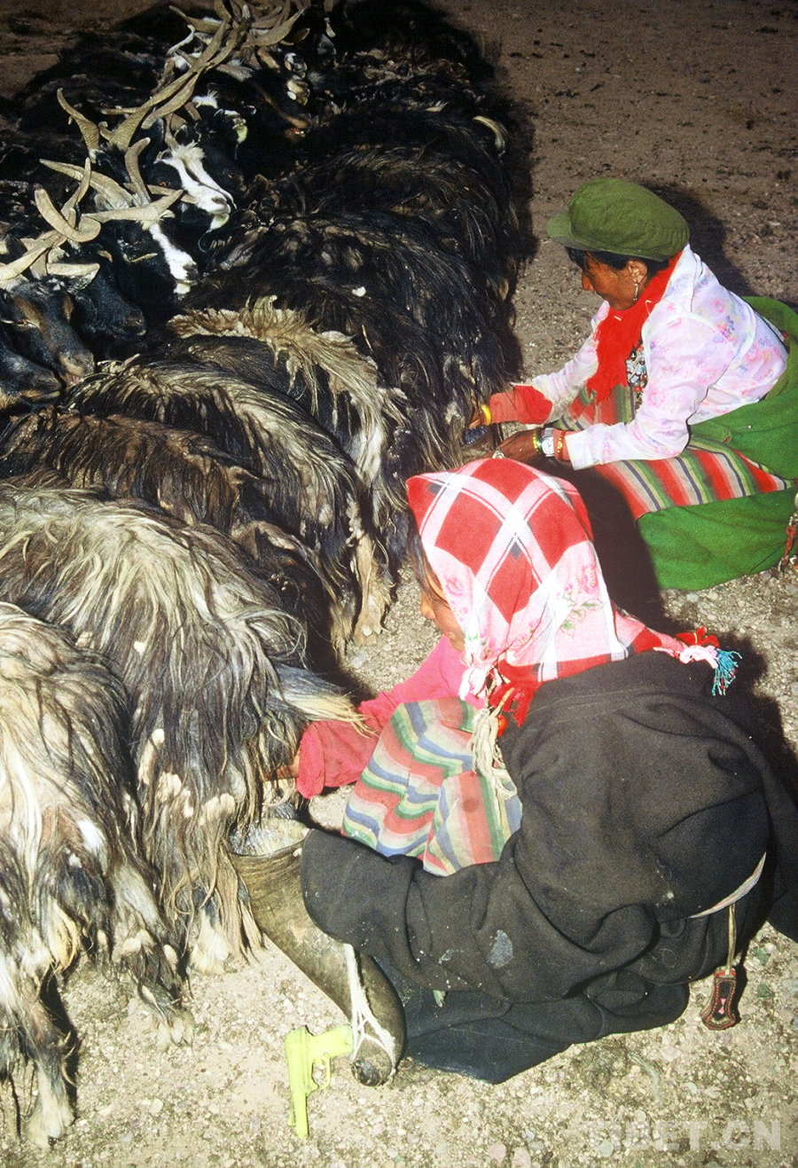圖為雙湖辦事處北措折鄉(xiāng)(現(xiàn)雙湖縣措折羌瑪鄉(xiāng))牧女使用牦牛角當器皿擠羊奶(唐召明1989年攝)