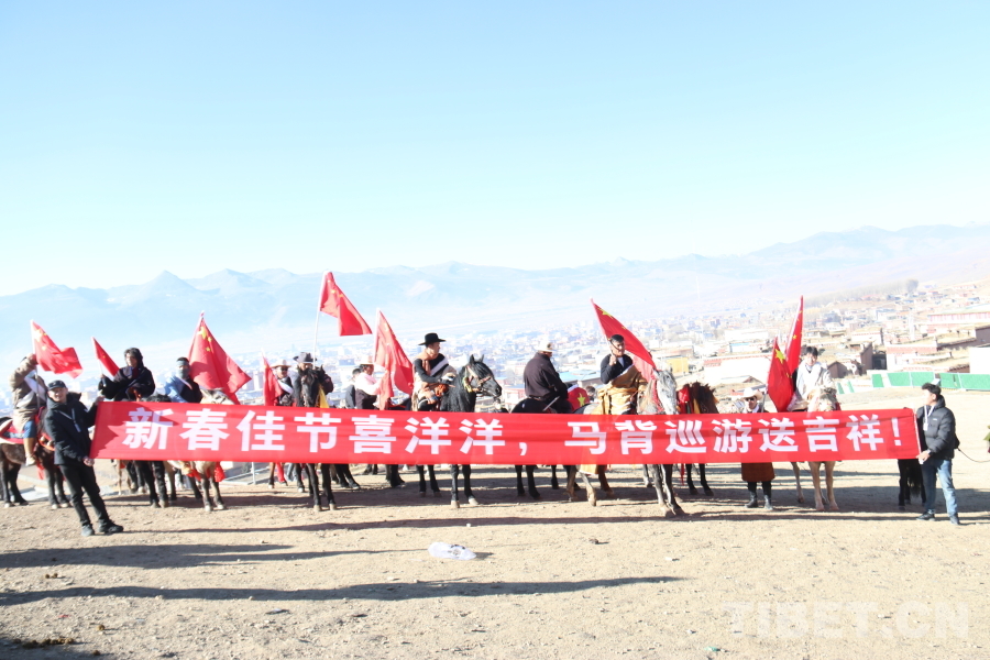 馬術(shù)巡游隊(duì)伍來到理塘東山頂上,俯瞰縣城全景,并展開祝福橫幅,用藏漢雙語高聲祝愿全國(guó)各族人民新春吉祥。