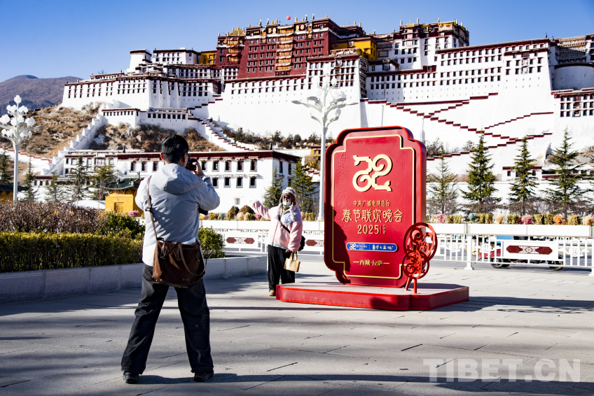 圖為游客在央視春晚西藏拉薩分會場標(biāo)識前打卡 攝影:趙振宇